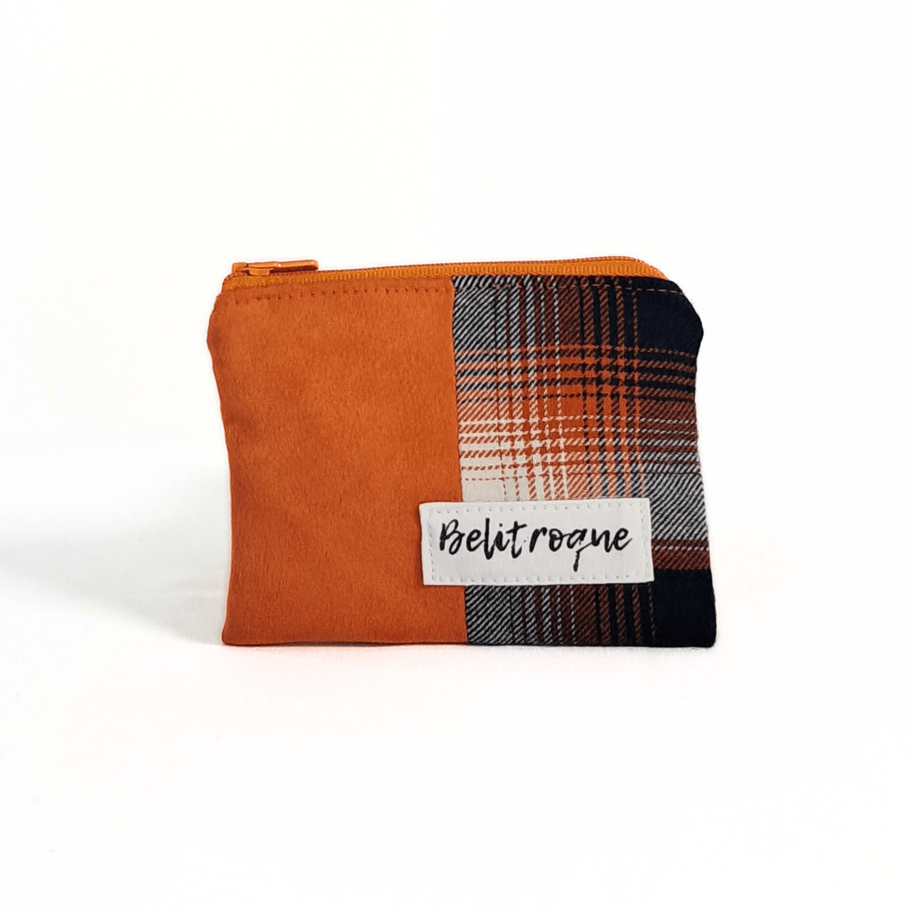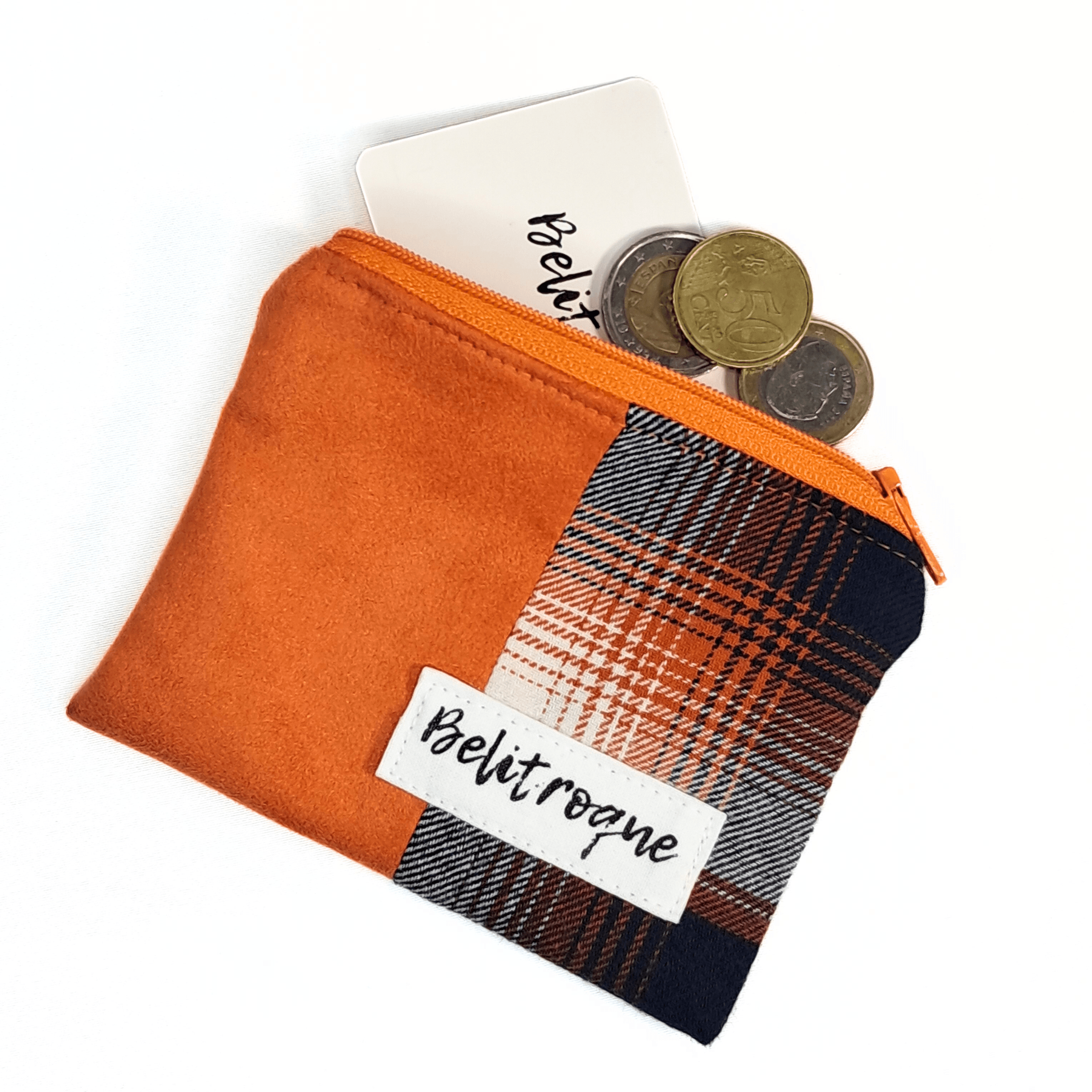 Conjunto de totebag reversible y monedero naranja y cuadros.