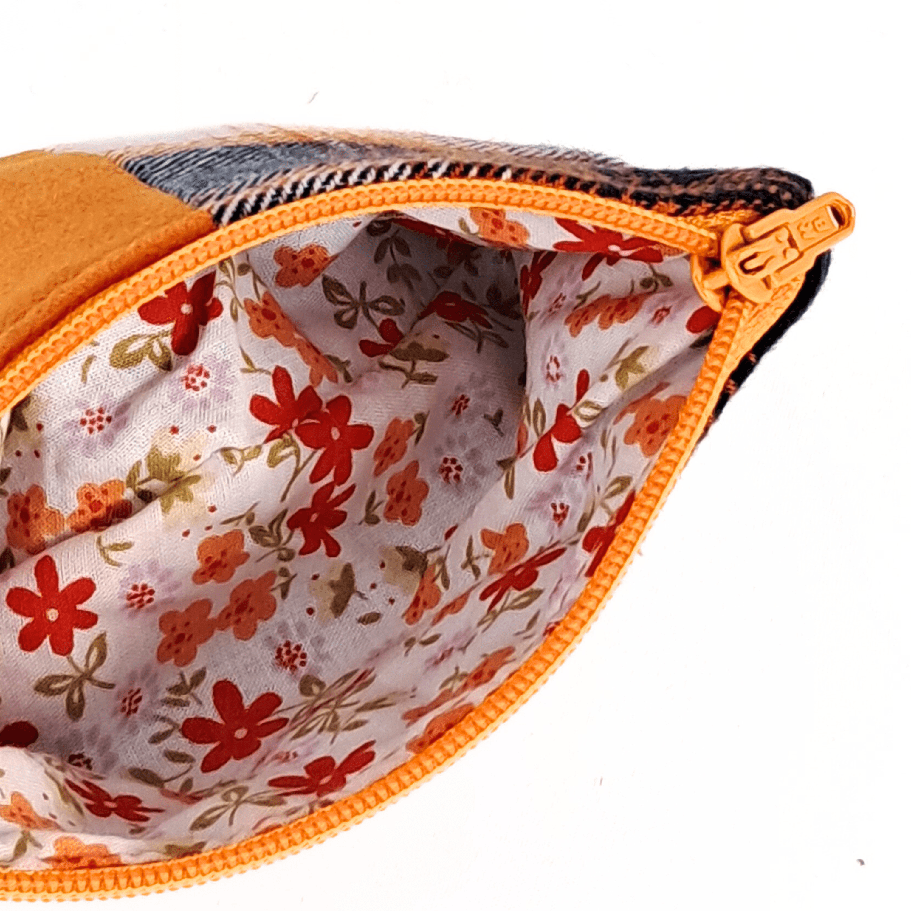 - Composición: Un lado está hecho con tela rescatada de una camisa y una falda naranja de antelina, mientras que el otro es de tela estampada de algodón. Las piezas está entretelada para mayor resistencia.