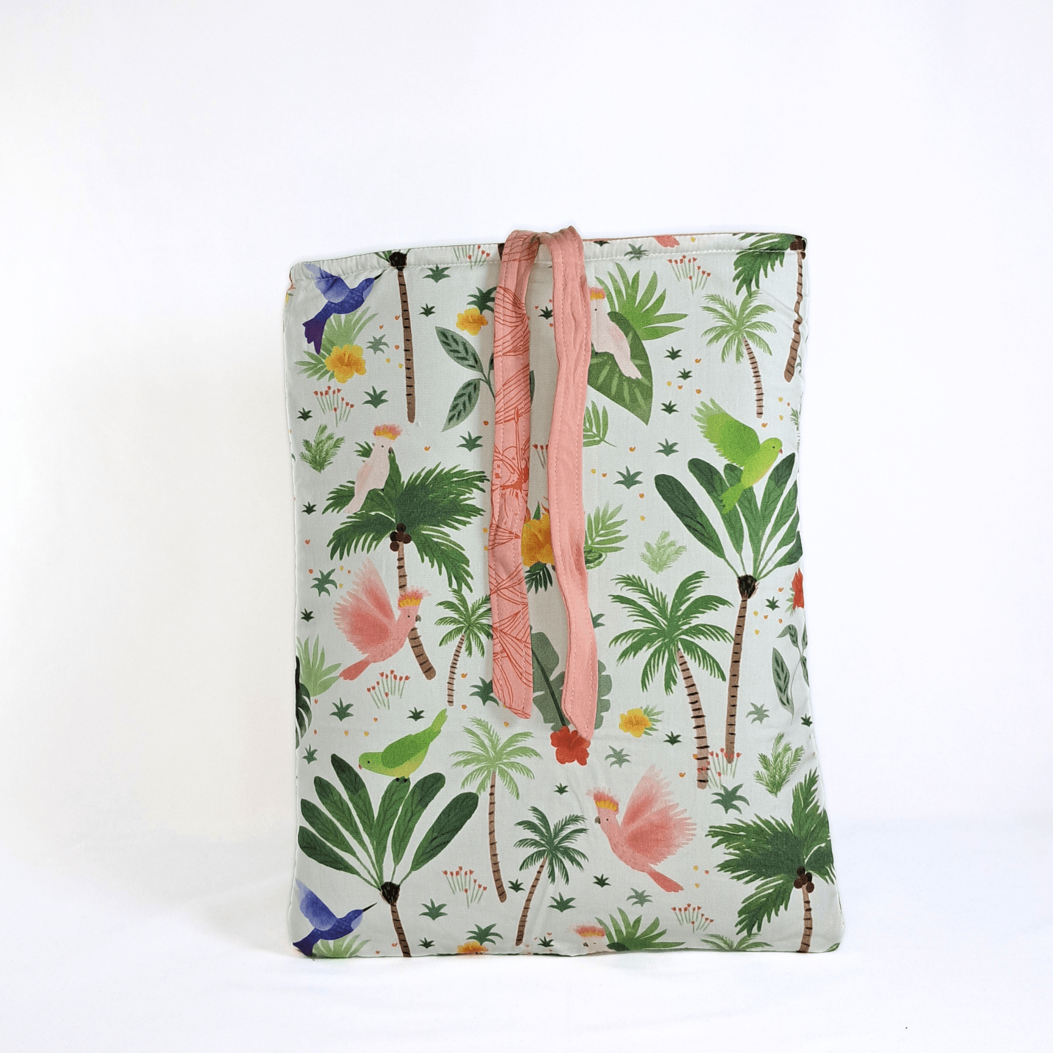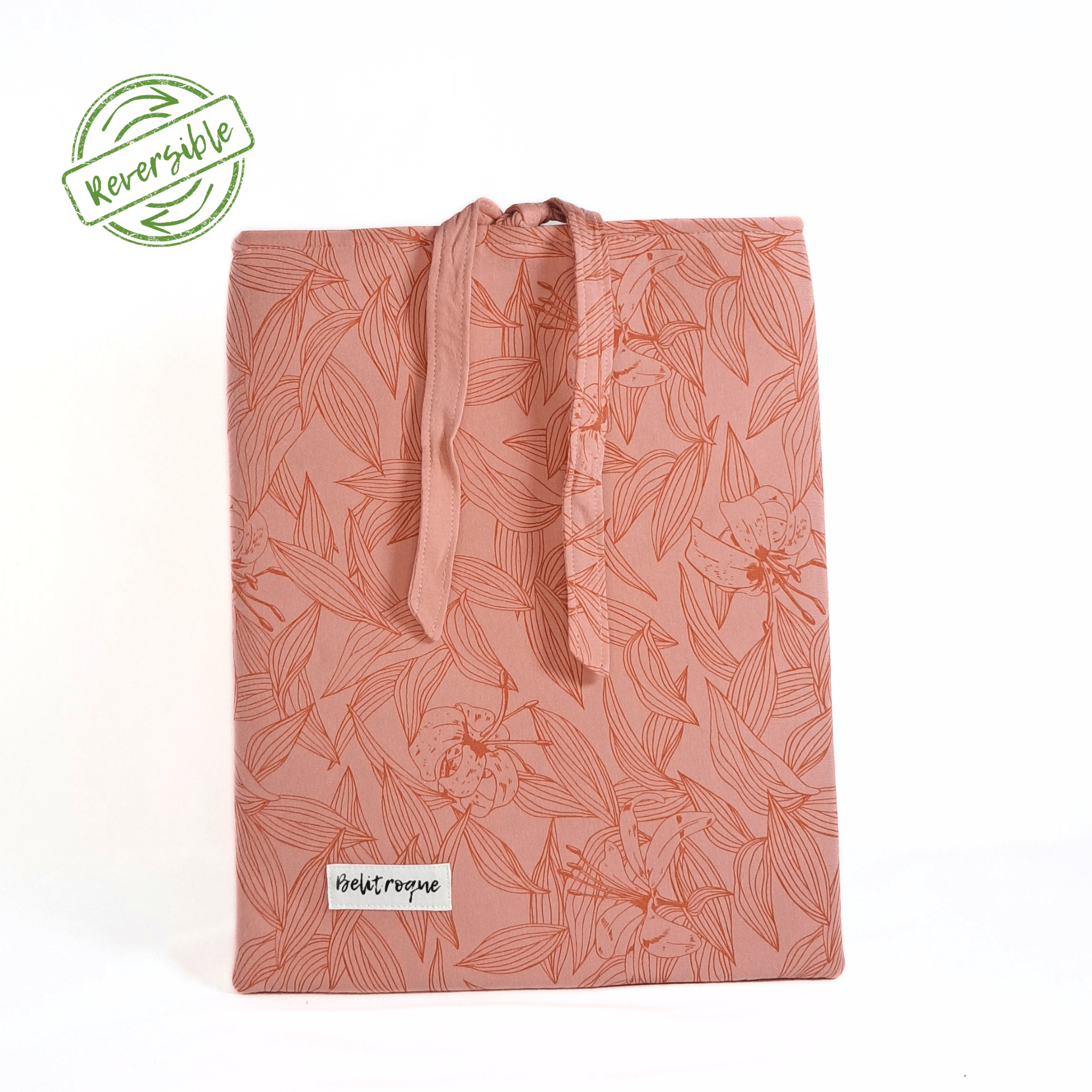 - Composición: Un lado está hecho con tela rescatada de una camiseta, mientras que el otro es de tela estampada de algodón. La pieza está entretelada para mayor resistencia.
